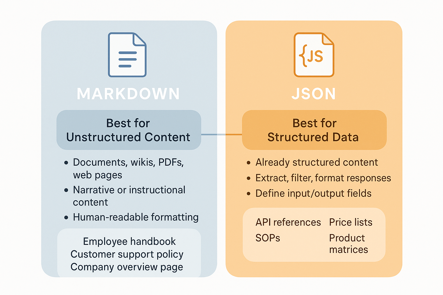 * **Markdown** = flexible for unstructured data; **JSON** = precise for structured knowledge
